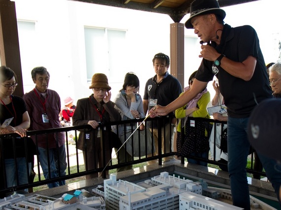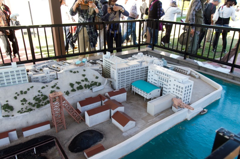 - 石炭資料館の中庭の大きな軍艦島の模型を使って、軍艦島の説明が受けられます。島全体の構造を把握するのに役に立ちます。