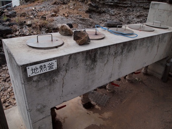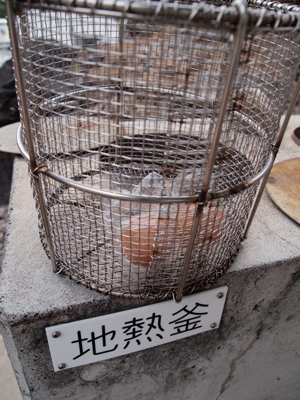 目的地のふれあいサウナはすぐそこですが、その手前にも先ほどのとは違う形の地熱釜があります。こちらは小さめ。コンクリの流しのような台の中に並んでいて、蓋は上にあります。蓋をあけると、金属の網カゴが入っています。