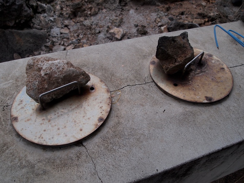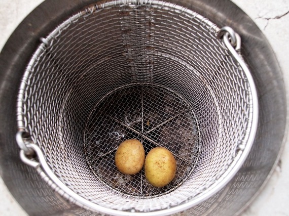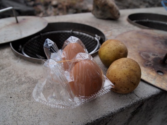 カゴを取り出して、ここに今朝宿に人にもらった生のじゃがいもと玉子を入れます。再度カゴを戻して蓋をして、そばに置かれている石で蓋に重しをして、台の下にあるバルブをひねります。