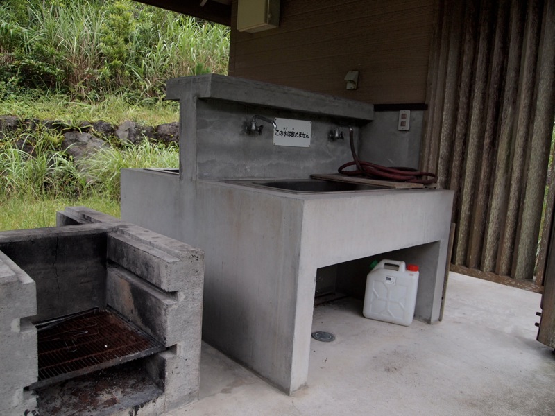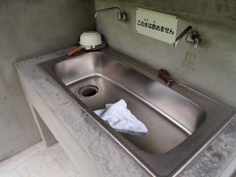 確かキャンプ場は水はないと各種ガイドには書いてあったのですが、炊事場にはちゃんと水道がありました。ただし飲めないと注意書きがあったのでおそらく雨水を溜めたものでしょう。なぜか真新しいボールと鍋、タオルが置かれていました。周囲には人はなし。誰かの忘れ物でしょうか。