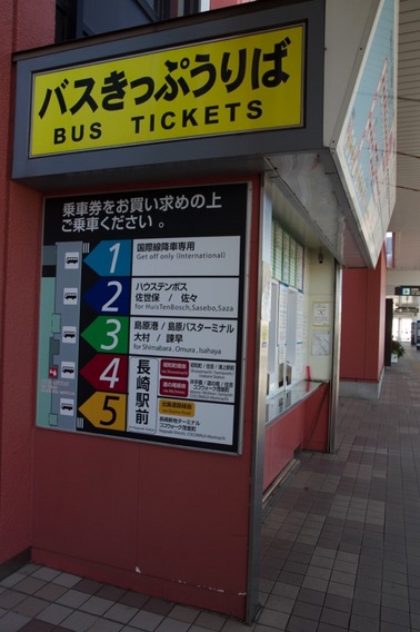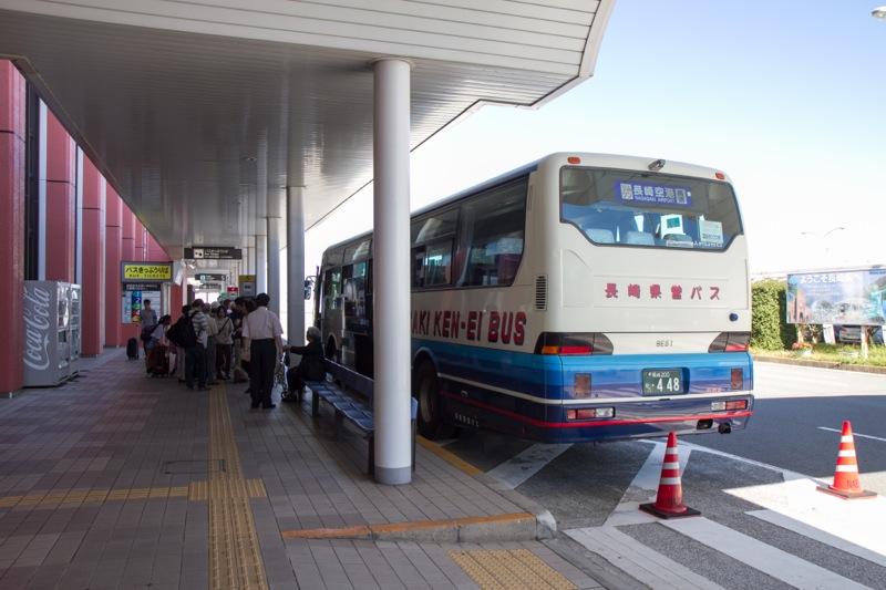 到着した長崎空港は、地方空港っぽくこぢんまりした印象です。初めまして九州! 預けた荷物を受け取って、正面の5番出口を出るとすぐ左手に、長崎市街などへ行くためのリムジンバスの券売機があります。空港から終点長崎駅まで、片道だと800円ですが、往復で買うと1200円、片道600円の計算になりお得です。1時間に2〜3本ほど発車しています。