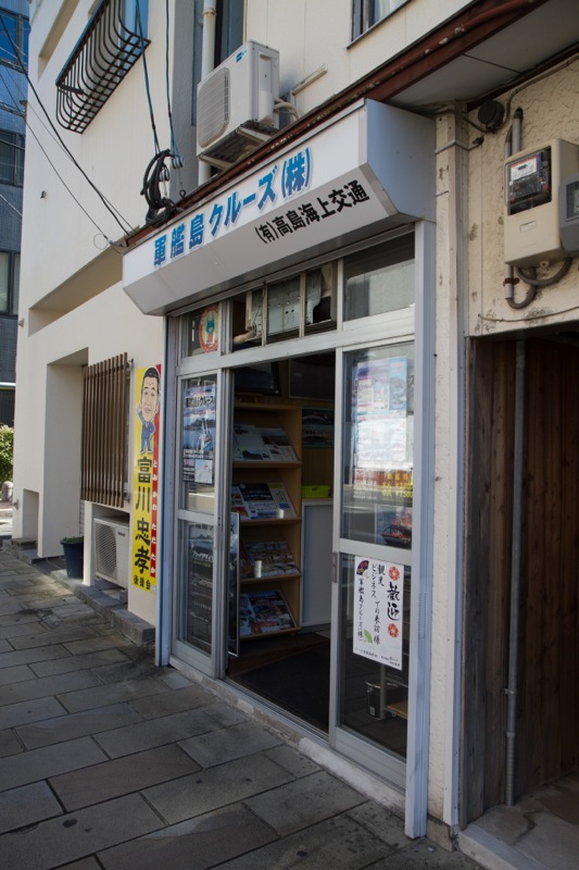 宿のある長崎新地中心から歩いても15分くらい。路面電車の駅で言うと「大波止駅」が最寄りです。ぱっと見小さな事務所っぽいですね。入り口に「軍艦島クルーズ」の文字が光ります。