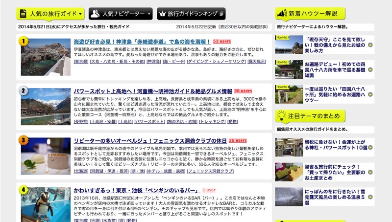 特定のジャンルやエリアの旅行に詳しい「ナビゲーター」達が、魅力的な写真とともに様々な旅行ガイドを掲載。