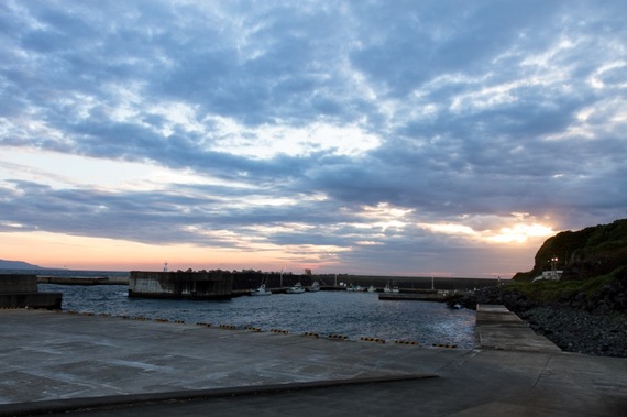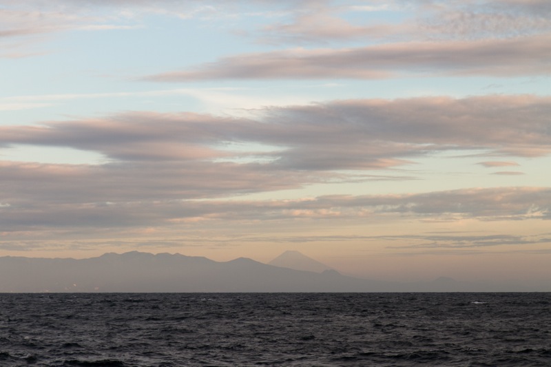 起きて外を見るとやはり風が強くなってきています。予定通り朝の便に乗ることにします。港まで車で送ってもらうと、朝焼けの中、遠くに富士山も見えました。島の朝はいつも清々しいですね。