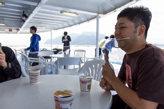 そして、これも船旅のお供、カップヌードルで軽いお昼にします。船内の自販機が買えるので毎回つい買って食べてしまうのです。