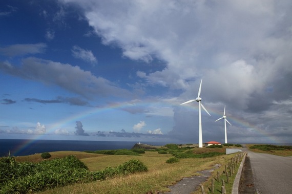 東の端が近づいてきたところで風力発電の風車と海が見えてきました。と、そこに虹がかかるという素晴らしい光景に出会えました。本当に、絵に描いたような一瞬です。