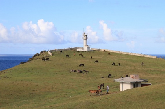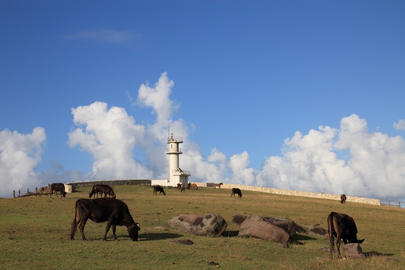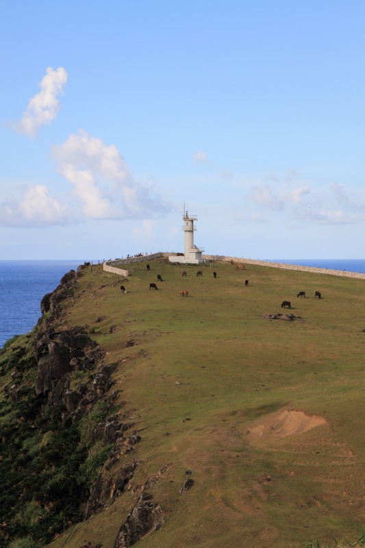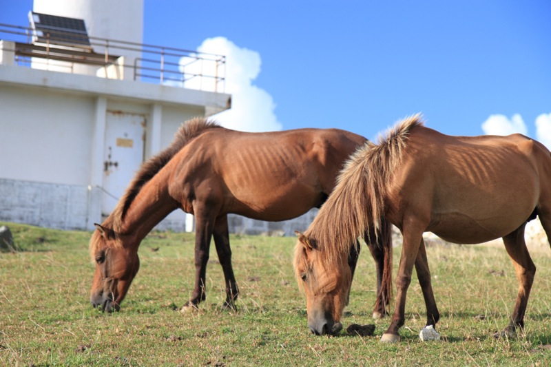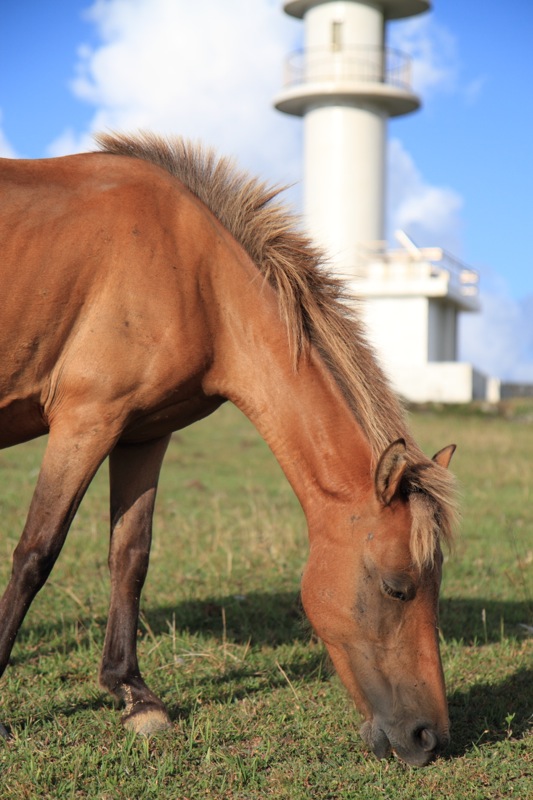 東崎は海から100mほどの高さの断崖絶壁の岬で、その名の通り、与那国島の一番東の端の岬です。岬の先には東崎灯台が建っていました。回りは牧草地でしょうか。馬や牛がのんびり草を食んでいます。