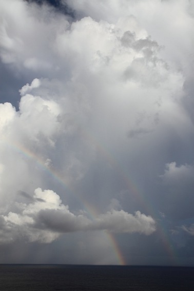 海の上では絶え間なくスコールが降ってるようで、あちこちで虹ができていました。