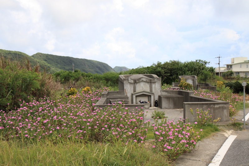 少しスクーターで走ると、花に囲まれたお墓を見かけました。親族の方が植えたのでしょうか。