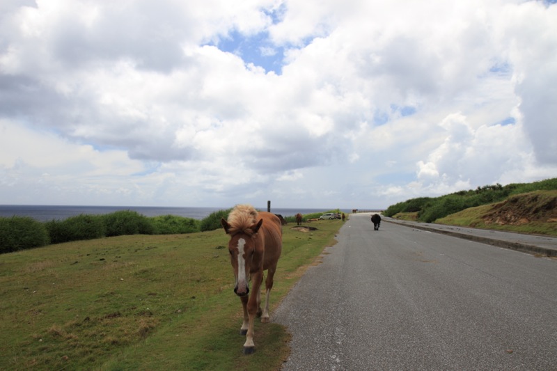 比川から西の端の久部良地区へ行く道路をスクーターで走っていると、向こうから与那国馬が歩いてきました。