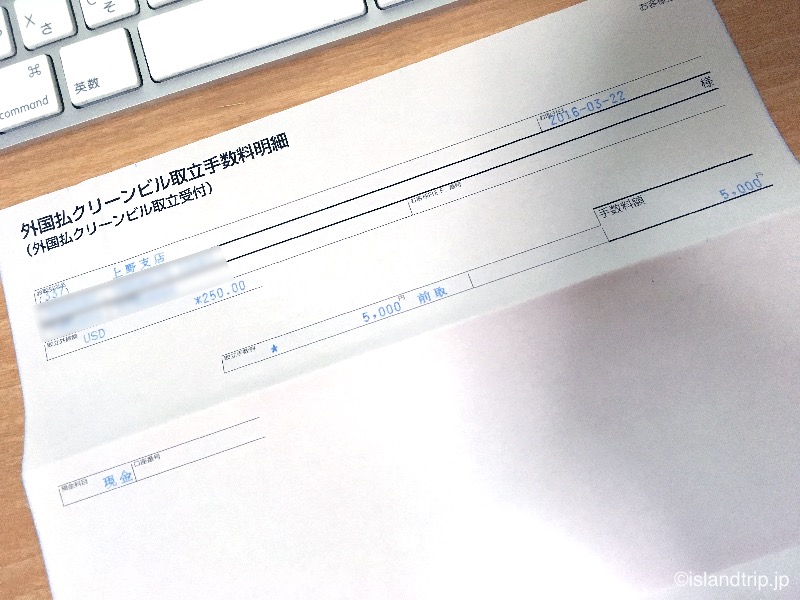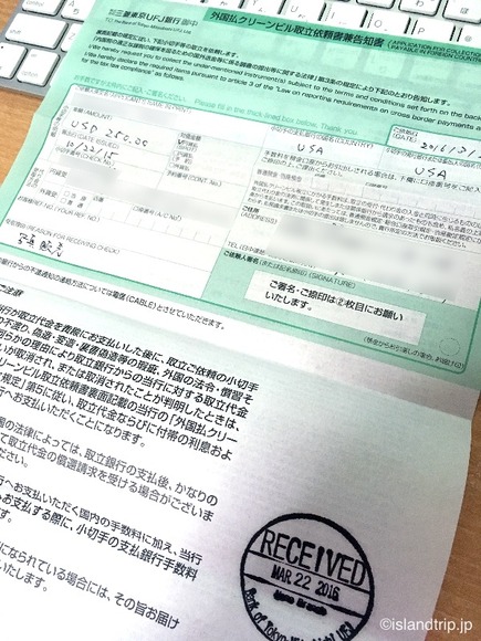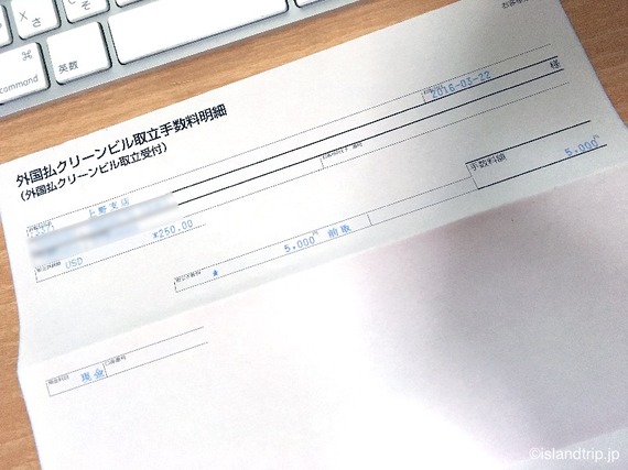 全ての手続が済むと、通帳と記入した書類の控えが返されます。通常は、1〜4週間で指定の口座にその日の為替レートで換算した金額が振り込まれるとのことです。やっと終わった! あとは待つだけです。