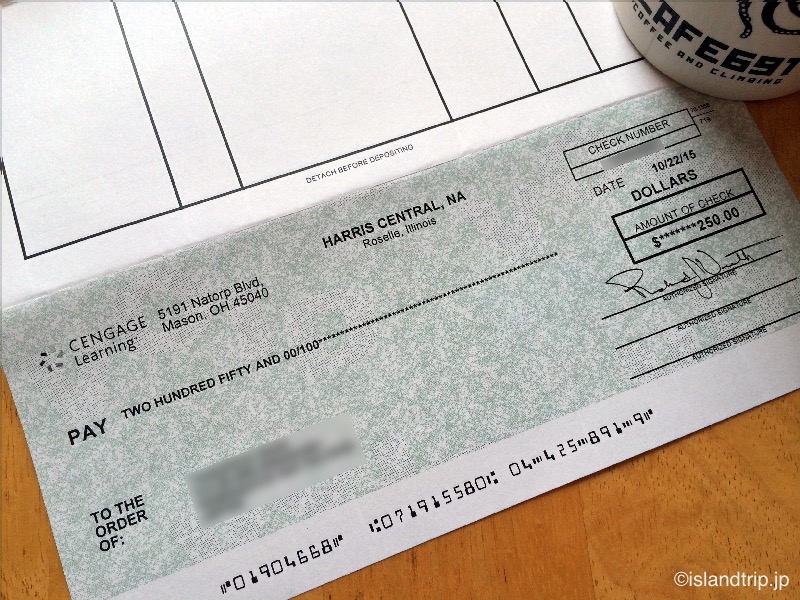 海外からの小切手、初めて見ました。体裁がよく分かってないのですが、依頼元であるセンゲージラーニング社からのもの、自分宛ての小切手であること、金額、などが記載されています。