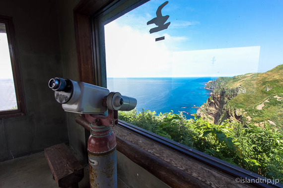 倍率50倍の望遠鏡を覗くと、眼下の千鳥ヶ浦の岩場にウミウやカモメの姿がしっかり見えます。