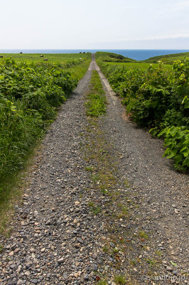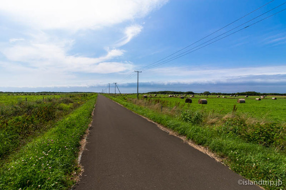 島の中央部を東西に抜ける道に出ました。両側に牧草地帯、その向こうに海が見える気持ちのいい場所。