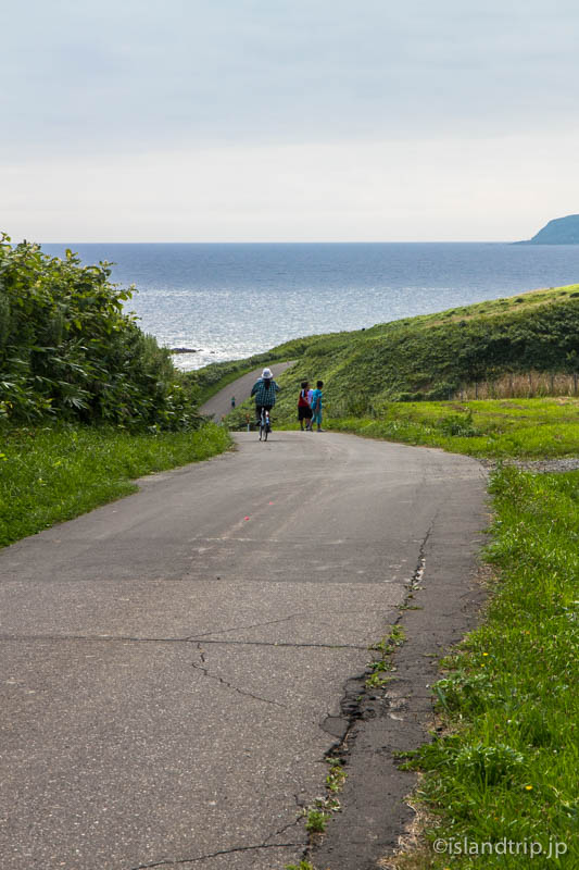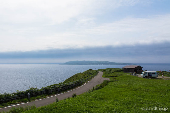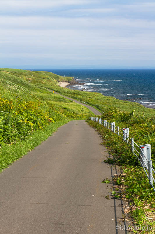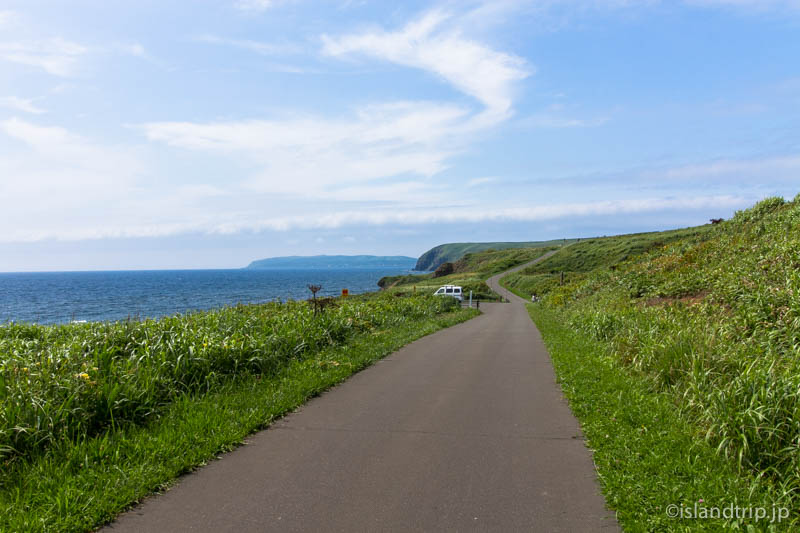 中央の道を西の端まで行くと、鷹の巣園地です。向こうに天売島が見えます。