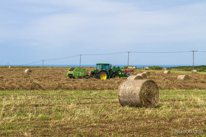 その向こうには乾燥が終わった牧草をロール状にする機械「ロールベーラ」がせっせと牧草ロールを作っていました。