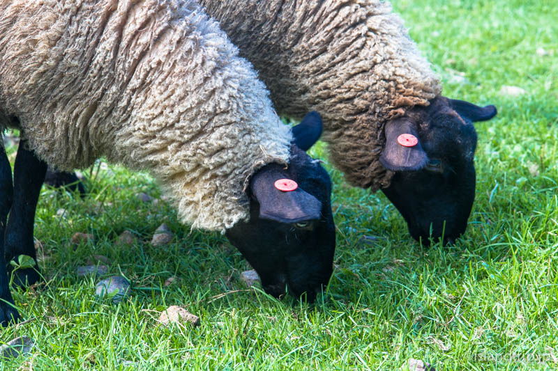 普通、羊と聞くと顔の白いものを思い描きますが、サフォーク種のめん羊はごらんの通り黒い。体の白とコントラストが逆に可愛らしさに一役買っている気がします。