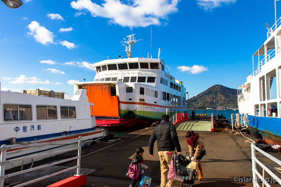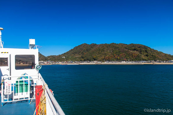 船内に接岸間近のアナウンスとともに、坂本冬美が歌う旧中島町のイメージソング「白いかおりの島へ」が流れ、忽那諸島最初の島、睦月島(むづきじま)に到着です。