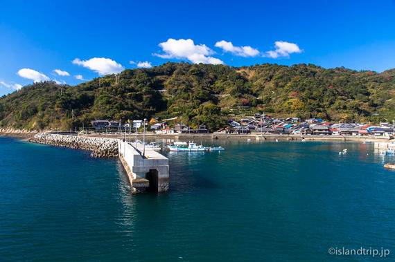 忽那諸島最初の島、睦月島はこんもりと台形の姿をした島。港の周りには集落が広がっているのが見えます。港で船を待つ人の姿もまばら。