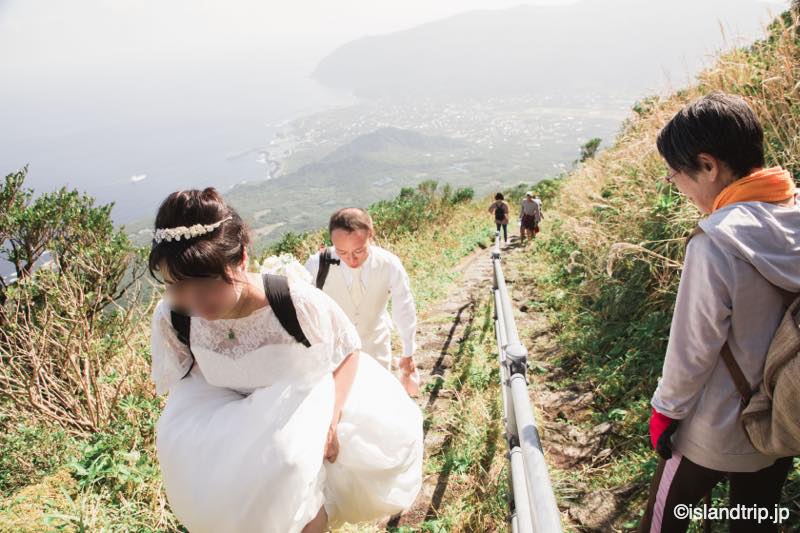 僕も奥さんもスニーカーで八丈富士や裏見ヶ滝を歩きました。足元が写るときだけ、ドレス用のヒールやタキシード用の革靴に履き替えてました。