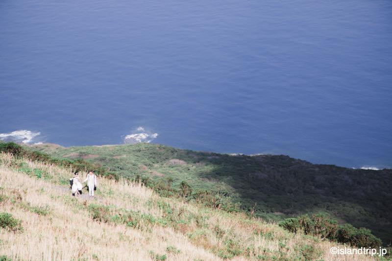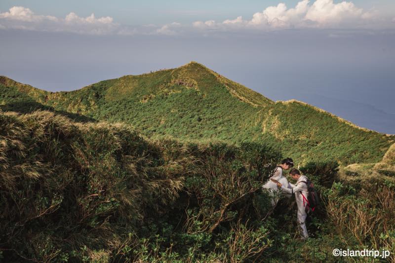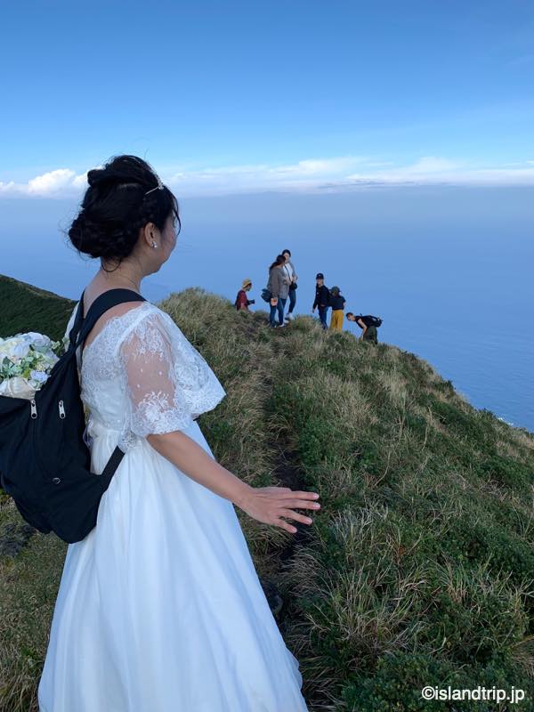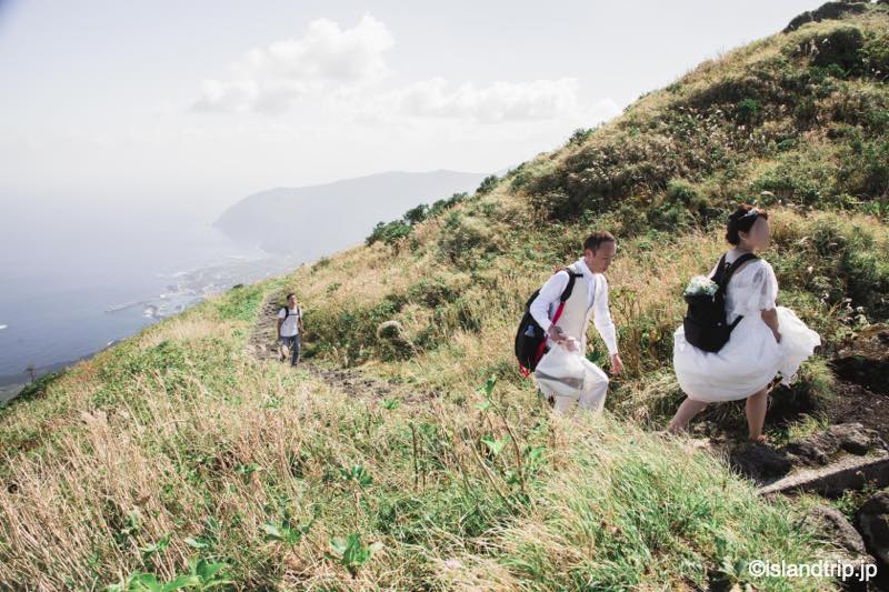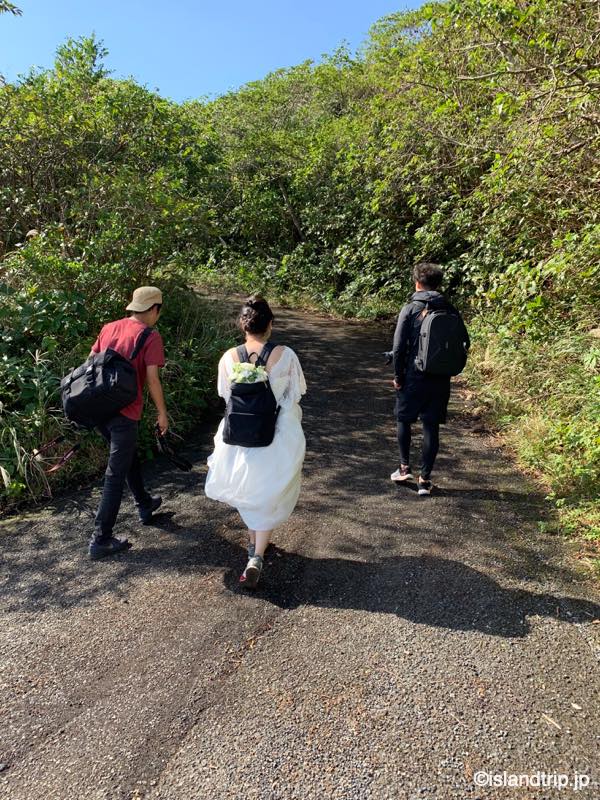 八丈富士では1時間ほど撮影して下山しました。下山風景も平田さんが抑えていてくれていて、面白かったです。ドレスとタキシードにリュックで登山。結構シュールです。