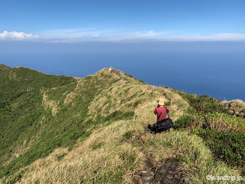 八丈富士の山頂にはカルデラが広がっています。お鉢巡りと称してその縁をぐるっと歩くことができます。そこに立ってカルデラとともに撮ってもらいました。