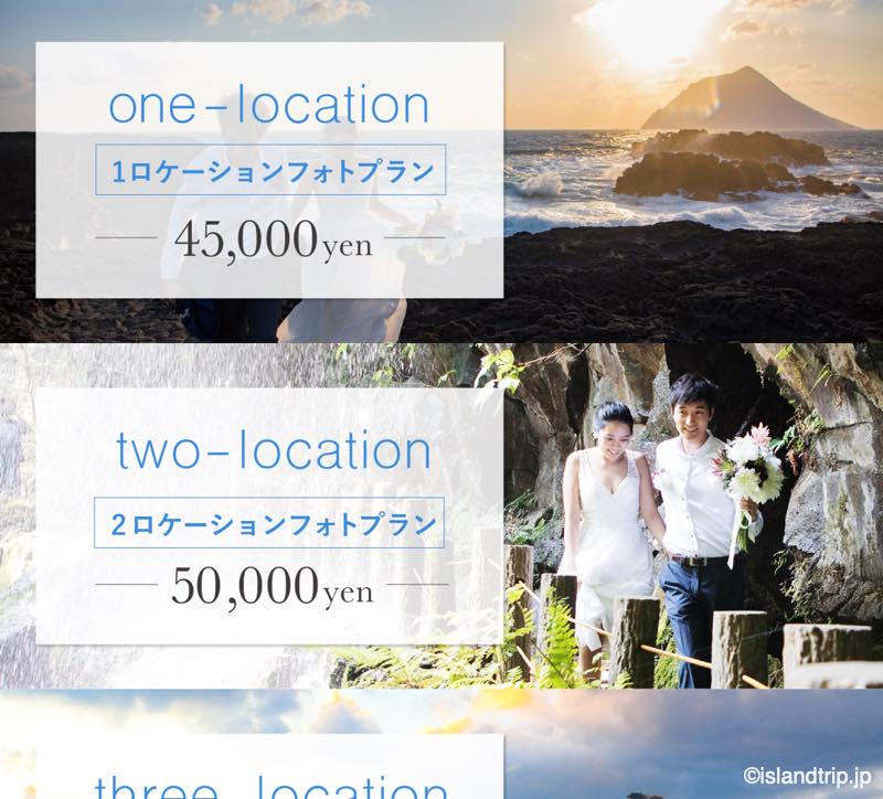八丈島フォトウェディングのサイトを見ると、「1〜3ロケーションプラン」、「八丈富士フォトプラン」が選べます。