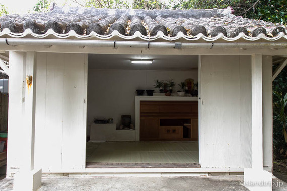母屋の隣の拝所は扉が開けられていました。位牌や火ぬ神が祀られているのが見えます。