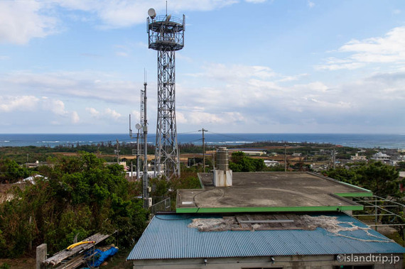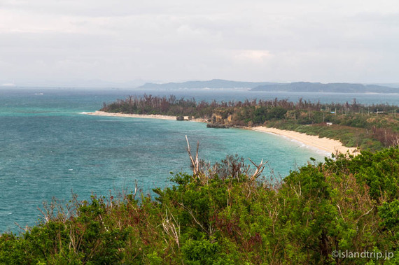 上に登ると津堅島が一望できます。こうやってみると、他の離島に比べて平坦なのがわかります。それでも自転車だと難儀する坂があちこちにありましたが。