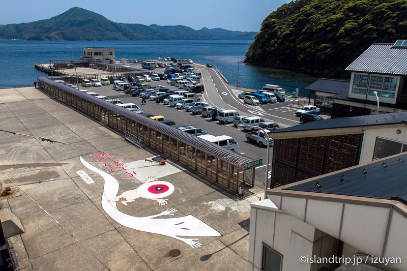 フェリーくにがは、定刻の11時30分に知夫里島の来居港に接岸。目を引くのは、船待合所の屋根に描かれた一反木綿。そう、空港もそうでしたが水木しげる縁の島根の島々にも、鬼太郎モチーフのものがあちこちにあるのでした。