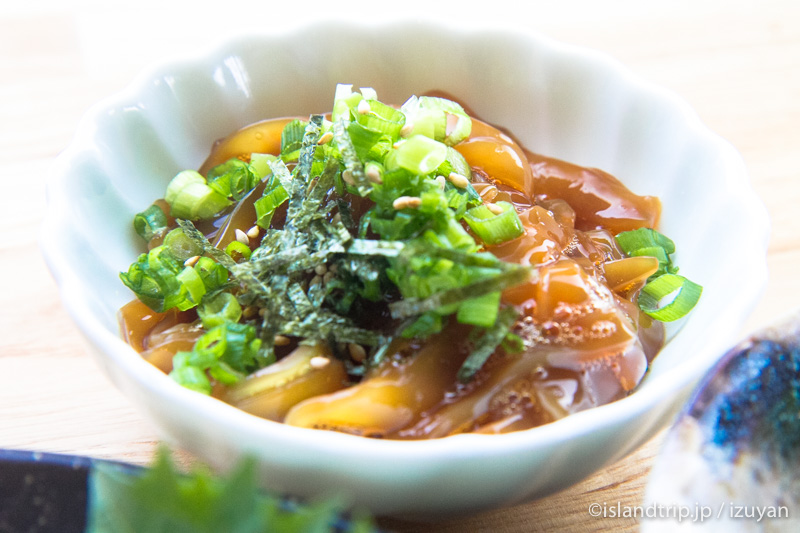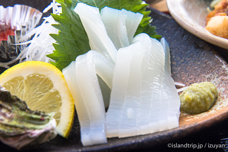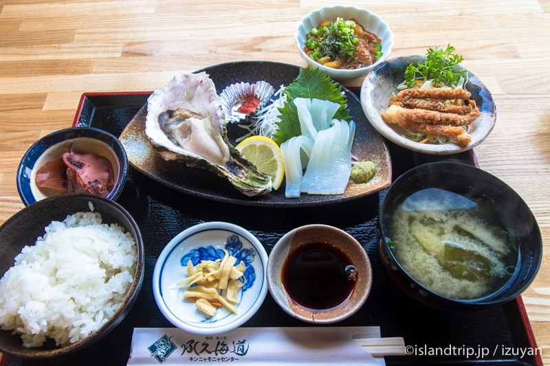 ここは奮発して、新鮮な白いか(ケンサキイカ)のお造りと海士町名産のブランド岩牡蠣「春香」がセットになった「スペシャルコロニー定食」2100円を注文。