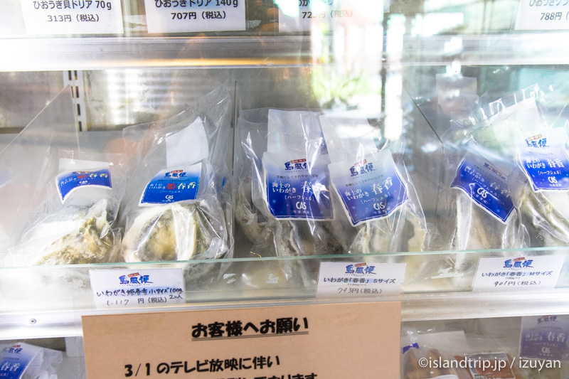 ランチ後は、キンニャモニャセンターの1階にある漁協直売店「大漁」を覗いてみると、岩牡蠣春香や島の海産物が売っていました。ここでも買えるんですね。正直ちょっと迷いましたが、テレビで放映されたあとでどうも品薄になっていたようでした。
