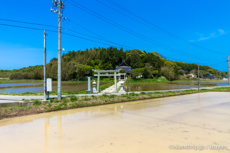 田んぼ沿いの道はやがて少し細くなり、昔ながらの集落の中を抜けていきます。左右を林に囲まれた道が開けたと思うと、左手に鳥居、さらにその奥に神社が見えてきました。