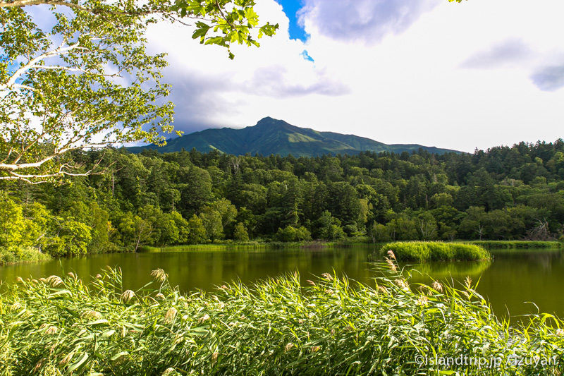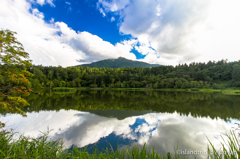 木道を進むといくつか展望所と言えそうな視界が開ける場所があり、姫沼に映る利尻富士を写真に収めることができました。が、やっぱり山頂だけ雲に隠れていて残念!