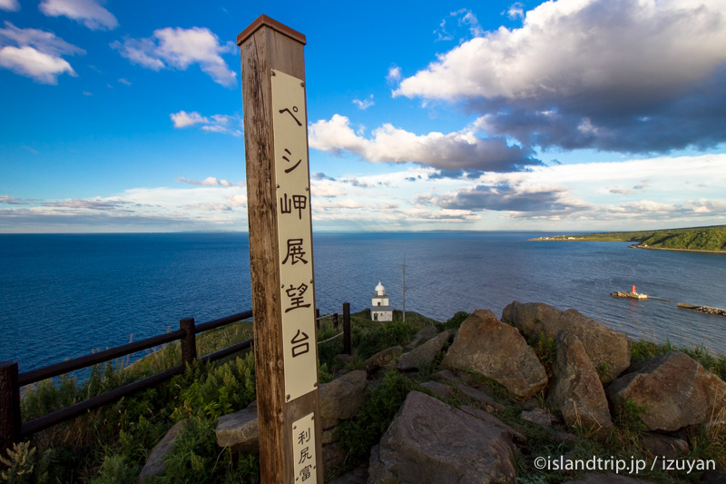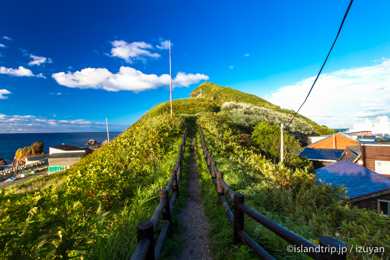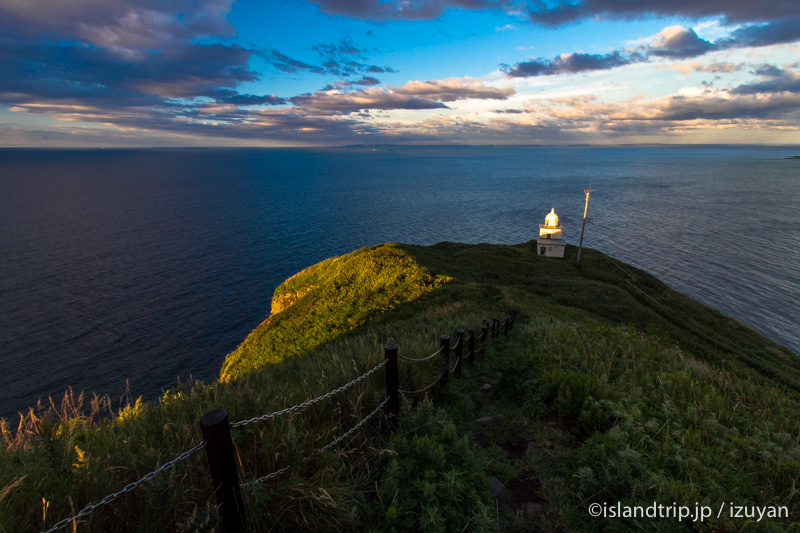 頂上から岬の先端部に向かって降りる道があり、その先には鴛泊灯台。これから暗闇に沈む海を照らす仕事を待っていました。