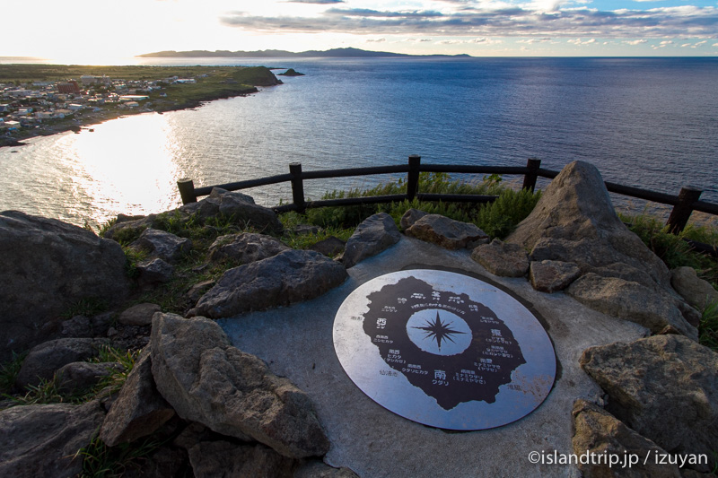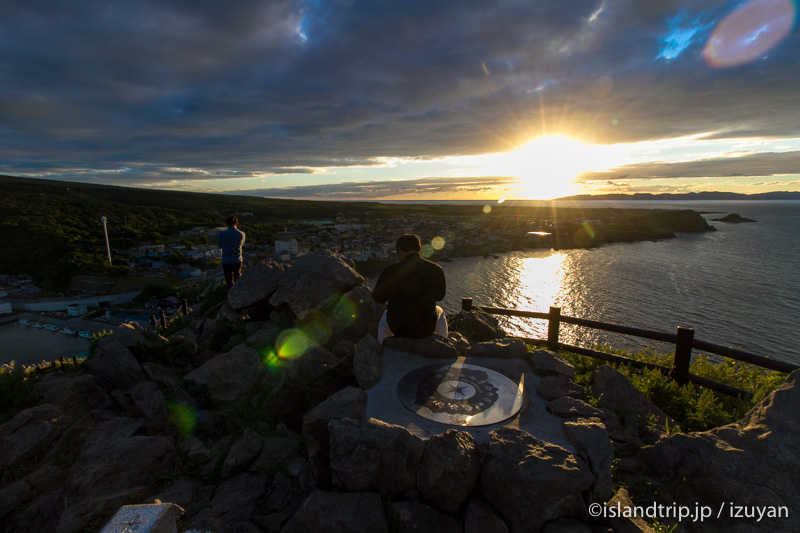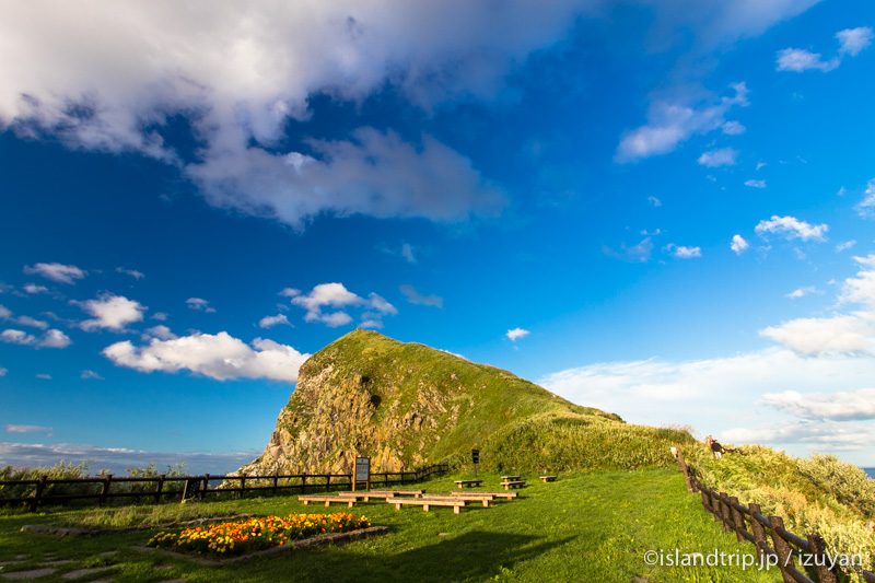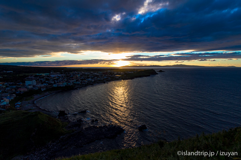 眼下に鴛泊港、その向こうに利尻富士。西に沈む斜光を浴びて海も草の斜面も金色に輝き、その存在をアピールするかのよう。