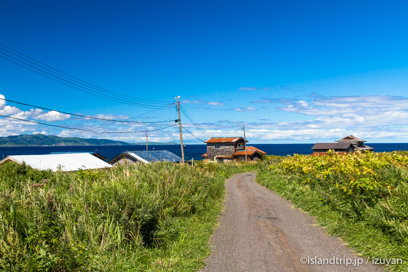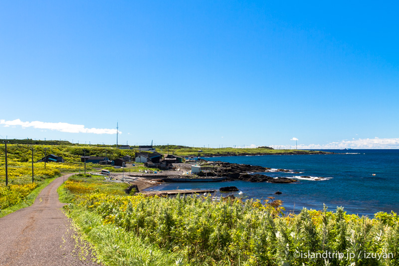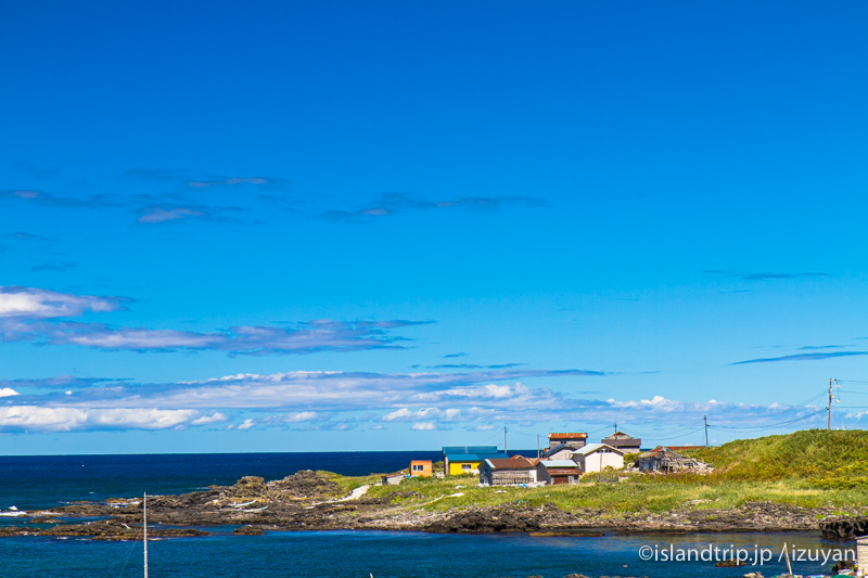 海岸沿いの集落の向こうには、海を隔てて礼文島。