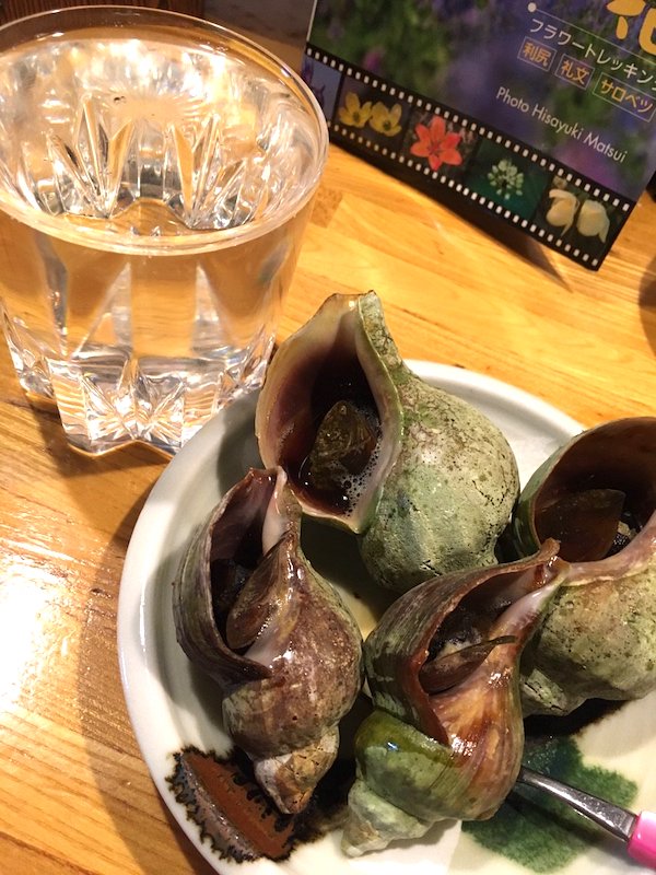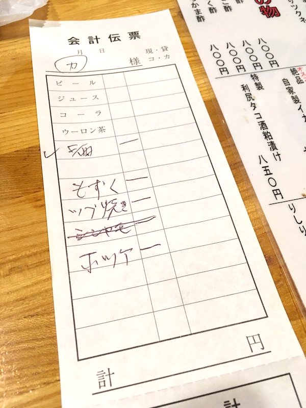 なんだか愉快な気分になりながら、北海道の銘酒「男山」のコップ酒、自家製塩辛、ホッケ、つぶ貝焼き、鮭おにぎり、ししゃも、を書き込みます。