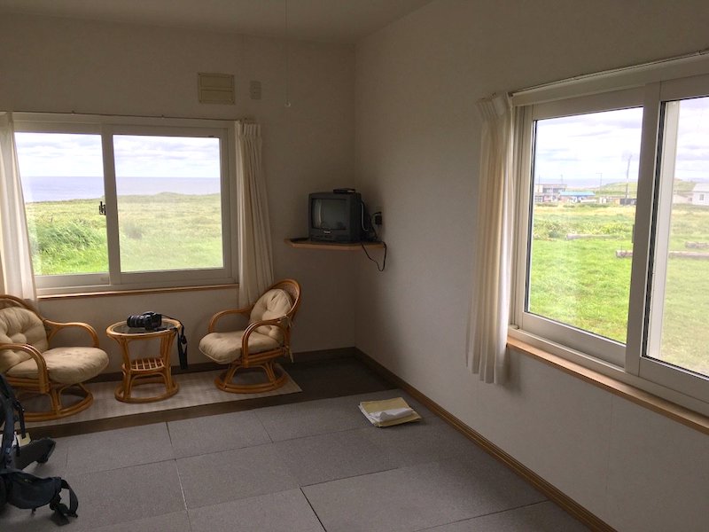 大きな窓の向こうには草原、そして日本海の水平線が広がっています。星観荘のこのミーティングルームからの眺めを見たくて今回礼文島に来たと言っても過言ではありません。もちろん島には他の見どころが山ほどあるのは重々承知していますが、僕は部屋から見る絶景にも目がないのです。