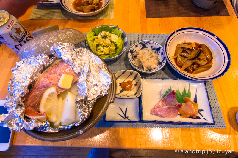 星観荘さんの夕飯は18時。ミーティングルームに行くと、テーブルの上にずらりと料理が並んでいます。お供はサッポロクラシック。